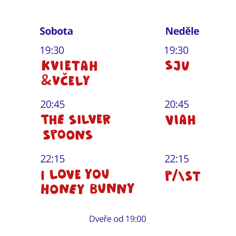 Sobotní večer ovládnou energičtí The Silver Spoons, I Love You Honey Bunny a Kvietah se svou kapelou Včely.